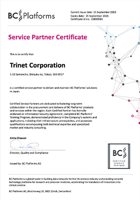 トライネットでは豊富な経験を元に、バイオ・アクセラレーター社と共に、データ利活用のグローバルリーダーであるBC Platformsのソリューション導入をはじめ、データ導入~データの蓄積(データレーク)~ETL~データ分析に渡るハイレベルな設計から構築・運用まで、お客様に必要なご支援を提供いたします。